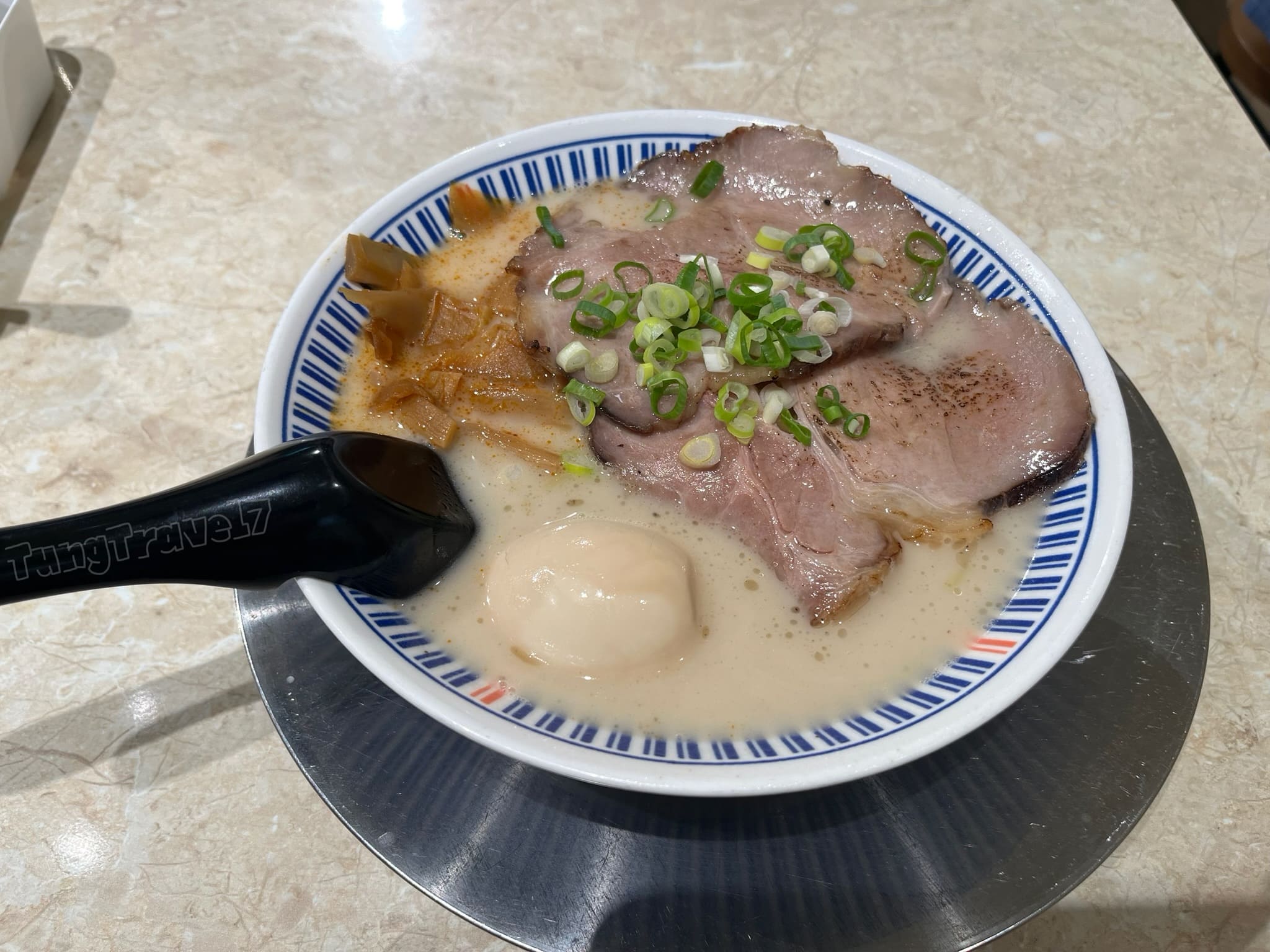 醬油豚骨拉麵的濃度很夠,在吃飯的當下有看到店員很努力的在熬湯,請且擠壓骨頭讓骨頭裡的精髓可以融入湯底裡,搭配著大塊的炙燒叉燒吃起來很爽。吃起來不會到太重鹹,如果不喜歡太鹹的拉麵位可以來這間嘗試看看~