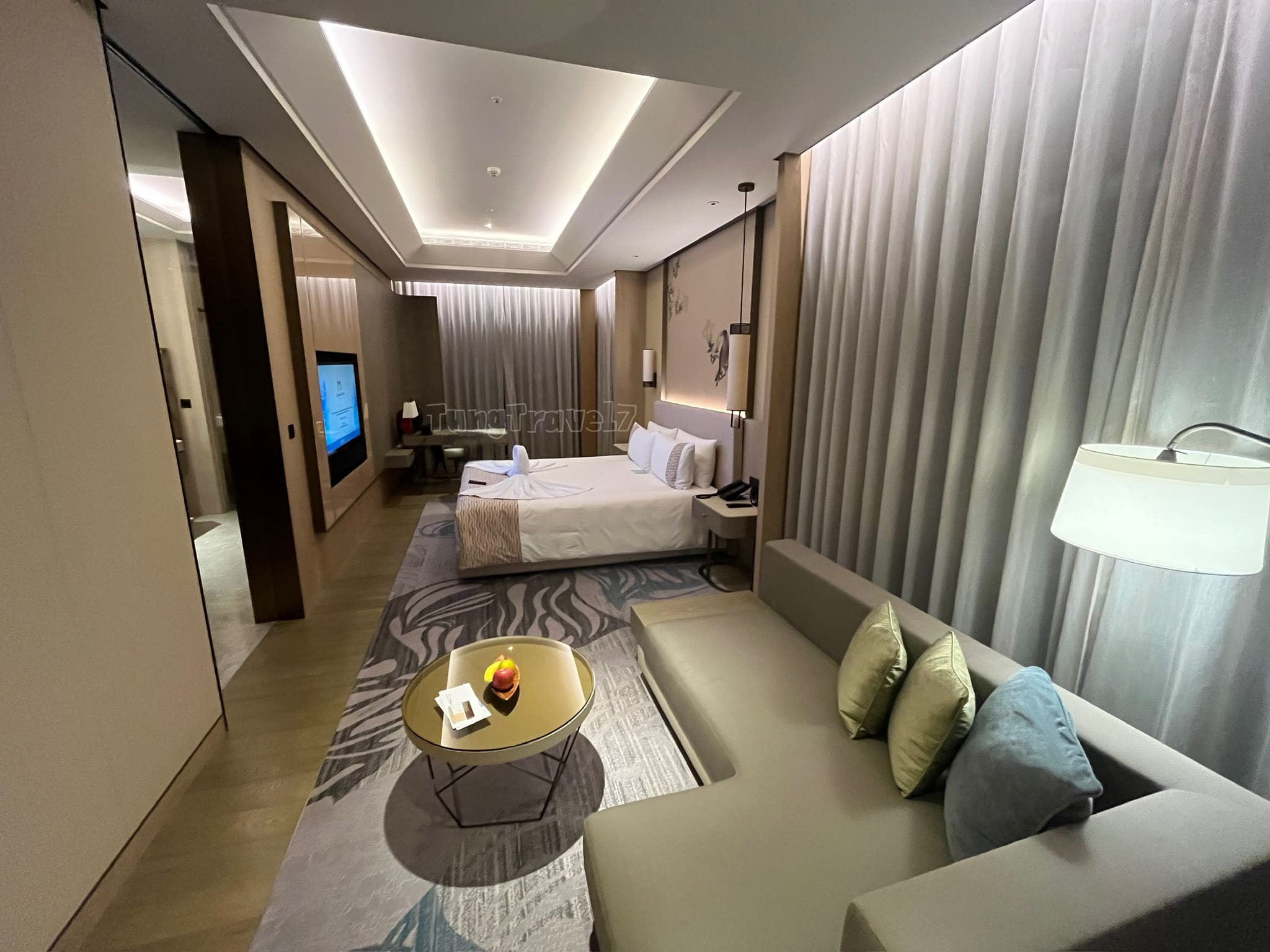 今天住的是菁英客房房間大概20坪大,臥室的配置是客廳、床、辦公區、陽台,浴廁區有用一扇拉門隔起。